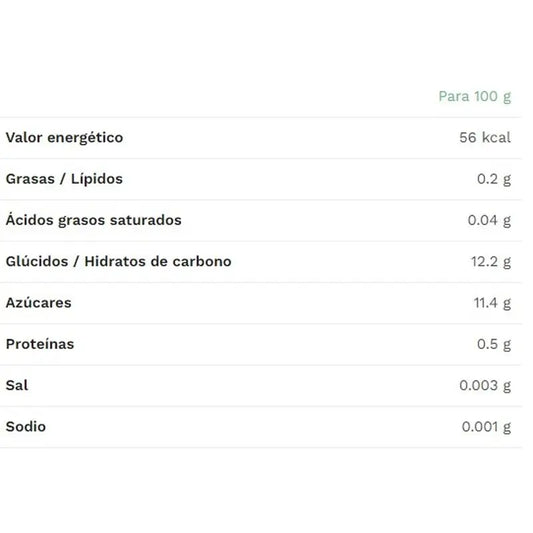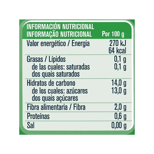Composition nutritionnelle pour 100g Energie 276 Kj / 65 Kcal Lipides dont saturés 0,3 Glucides dont sucres 14,5 g Fibres 0,4 g Protéines 0,3 g Sel 0,01 g Sodium 4 mg
