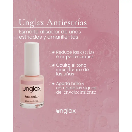 Unglax est une entreprise dédiée aux soins des ongles. Ses produits, développés par Laboratorios Viñas, sont composés d'ingrédients non agressifs pour la structure de l'ongle et exempts de substances nocives telles que le formaldéhyde, le camphre ou le toluène. Ses crèmes, vernis et dissolvants associent des essences naturelles d'huile d'amande douce, d'aloe vera et de céramides, pour des ongles délicats et respectueux de leur santé. Ils leur apportent brillance, force et dureté, et favorisent une croissance saine et moins agressive. Grâce à ses soins fortifiants quotidiens intensifs, Unglax régénère et restructure les ongles abîmés, tout en intégrant à son vernis un actif émollient et hydratant.