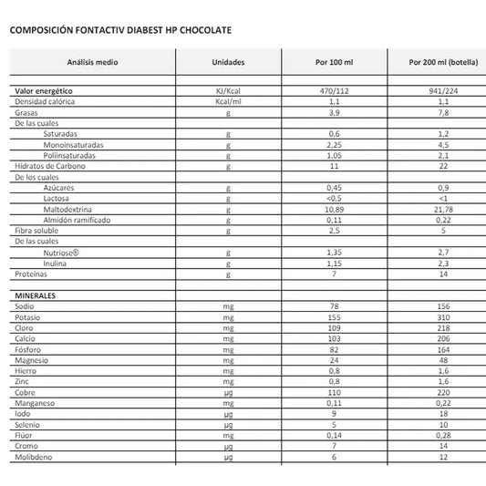 Fontactiv hp/hc Fibra Chocolate Flavour est un aliment qui apporte une grande quantité de minéraux, de vitamines, d'énergie et de protéines pour réguler l'organisme. Ce produit peut remplacer un régime complet en cas de malnutrition ou de risque élevé de malnutrition.