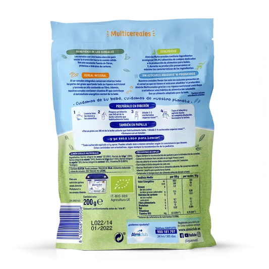 Farine de 8 céréales (92%) (blé, céréales complètes (31%), (blé et avoine), orge, épeautre, seigle, triticale, riz et maïs), miel (6%), minéraux (calcium et fer), arômes naturels et vitamines (C, niacine, E, B6, B1, A, acide folique, D).